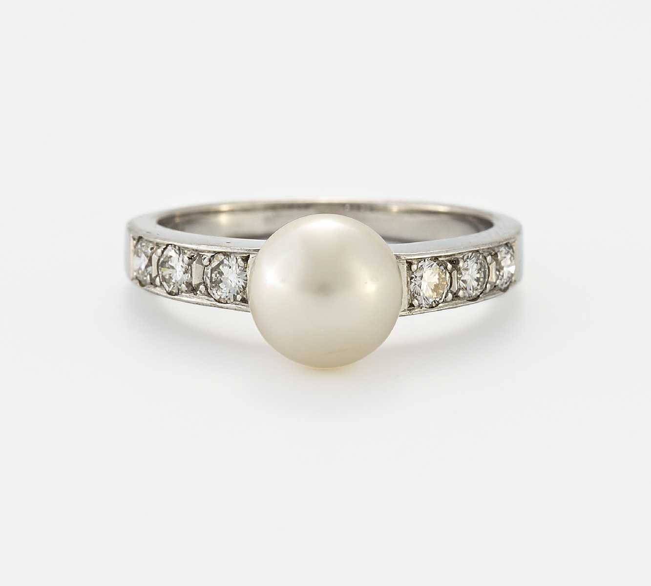 750/- Weißgold, Gewicht: 7,6g. 6 Diamanten zus.ca. 0,75ct, 1 Süsswasser-Zuchtperle D. 9,5mm, Körperf.: hellcreme, Überf.: creme-rosé,