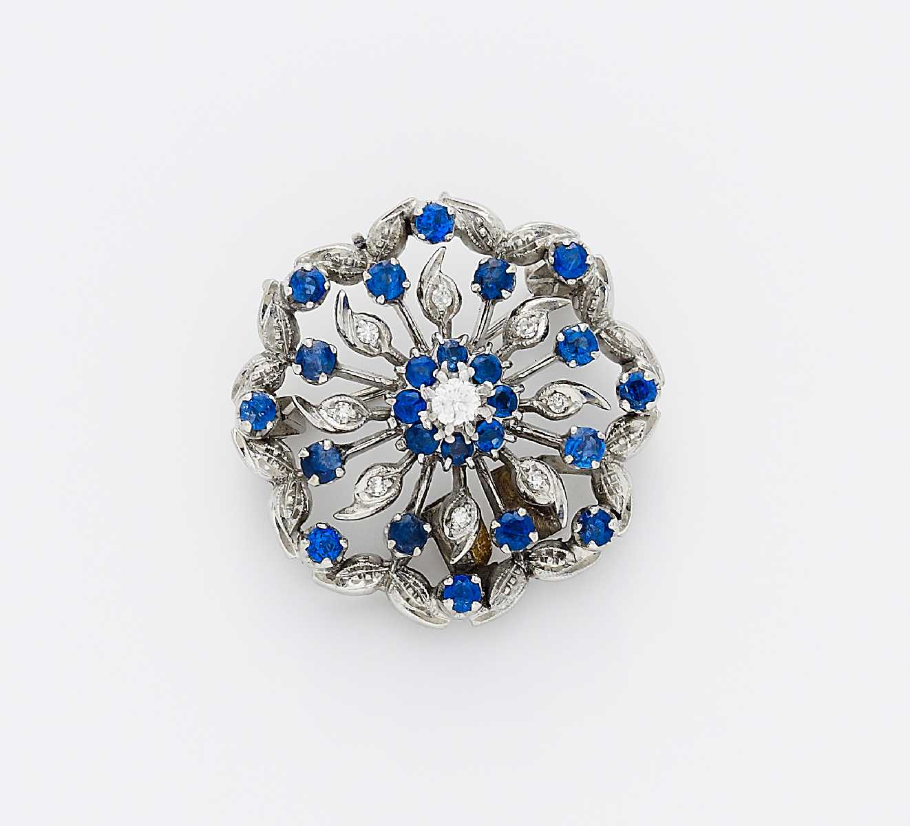 Rosettenbrosche mit Saphir-Diamant-Brillantbesatz.