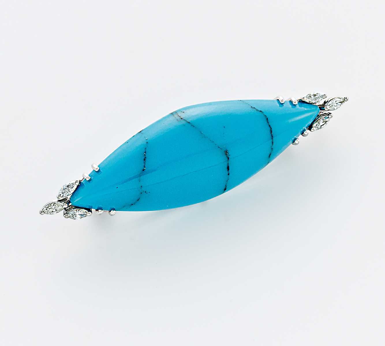 750/- Weißgold, Gewicht: 9,3g. 1 Türkis-Navette im Cabochonschliff ca. 1,5 x 4,3cm, 6 Diamant-Navettes zus.ca. 0,24ct, Schliff: gut, H x B=1,5 x 5,3cm.