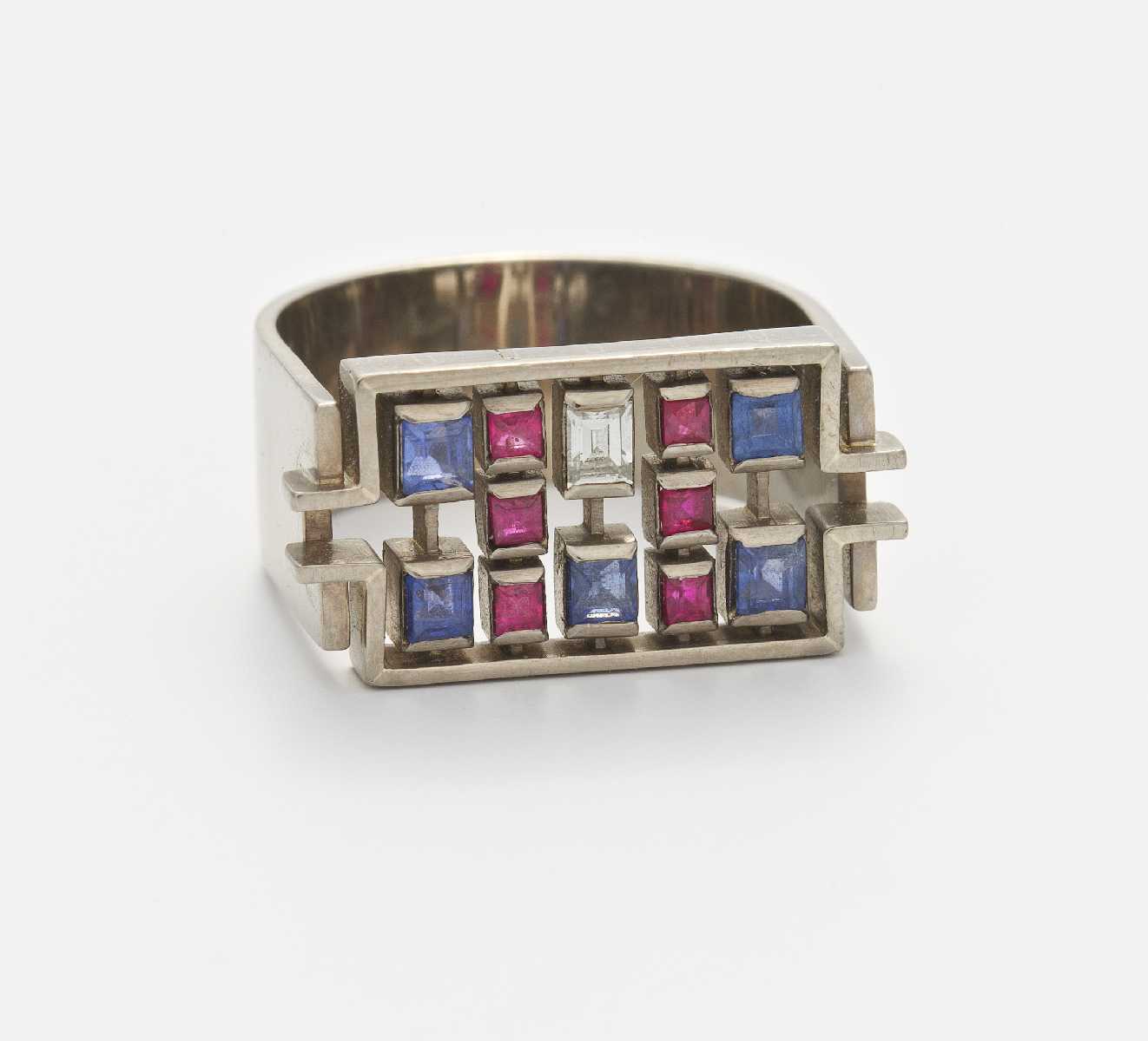 750/- Weißgold, gestempelt. 8,8g. 1 Diamant-Baguette, 5 Saphir-Karrees, 6 Rubin-Karrees, EU-RM: 56. Monika Brechler, Münster.