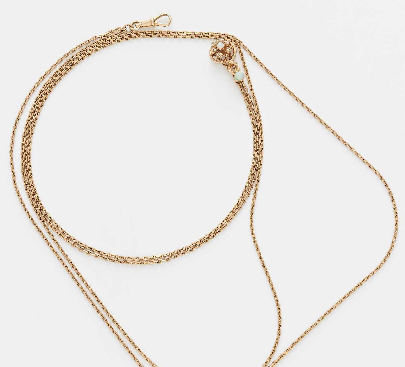 585/- Rotgold, gestempelt. 22,8g. 2 kleine Opal Cabochons D.: ca. 3,0 - 4,0mm, 12 winzige Saatperlen D.: ca. 1,3mm. Halslänge: 76cm.~