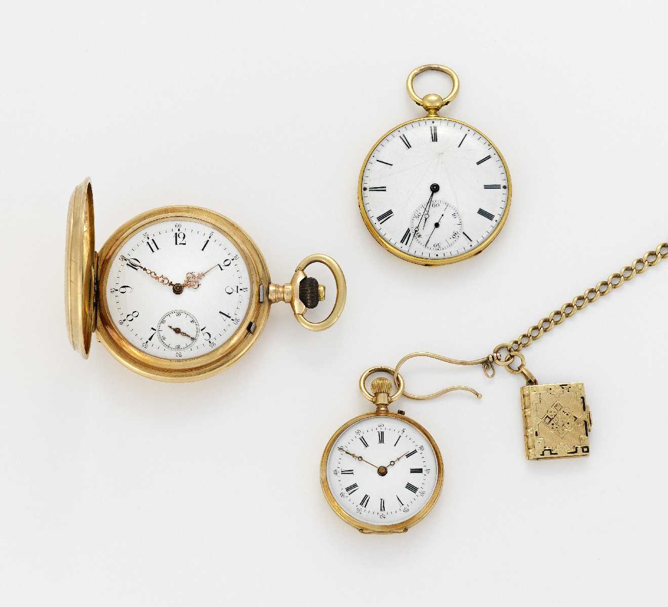 Beilage: Spindeltaschenuhr. Gehäuse: Taschenuhren: 585/- gestempelt; Spindeltaschenuhr: goldfarben, weiße Zifferblätter, schwarze Indizes/Ziffern, dez. Sekunde, Hand-/Schlüsselaufzug. Beilage: unedle Uhrenkette mit Buchanhänger, rotgoldfarbene Uhrenkette (defekt). 1. 51mm, 2. 35mm, 3. 43mm. Gewicht: 1. 94,0g 2. 31,1g 3. 60,2g.