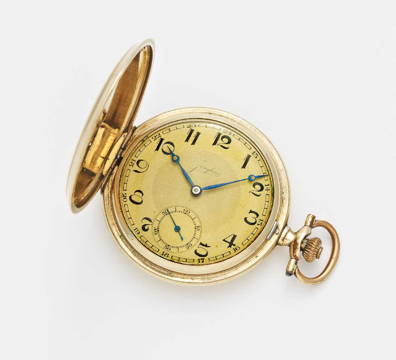 Taschenuhr. Gehäuse-Nr.: 03408. Werk-Nr.: 0438154. Gehäuse: Goldfarben, goldfarbenes Zifferblatt, schwarze Ziffern, dez. Sekunde, gebleute Zeiger, Handaufzug. D. 51mm. Gewicht: 91,0g.