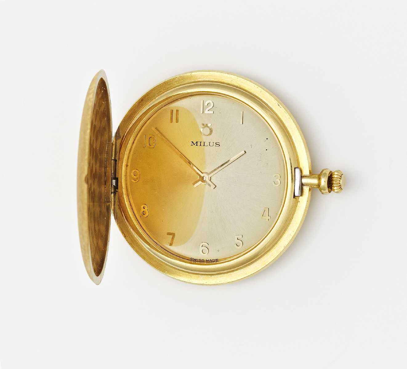 Taschenuhr. Gehäuse: 750/- Gelbgold, gestempelt, goldfarbene/es Zifferblatt/Ziffern und Zeiger, Handaufzug. Ziffer "2" nicht vorhanden, Aufhänger defekt. D. 39mm. Gewicht: 39,1g.