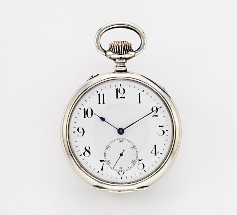 Taschenuhr. Gehäuse-Nr.: 373834. Werk-Nr.: 353444. Gehäuse: 900/- Silber, gestempelt, weißes Zifferblatt, schwarze Ziffern, gebleute Zeiger, verschraubte Chatons, Breguet-Spirale, Schrauben-Kompensations-Unruh, Schweizer Ankerhemmung, Feinregulierung. D. 55mm. Gewicht: 124,2g.