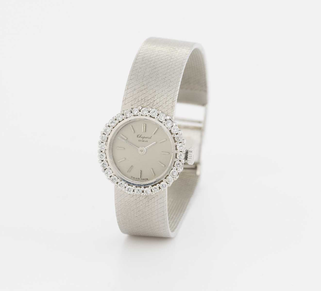 Cocktailarmbanduhr. Gehäuse: 750/- Weißgold, gestempelt, silbernes Zifferblatt/Indizes/Zeiger, Brillantlünette, Handaufzug. In Chopard-Etui. D. 19mm, 16,0cm lang. Gewicht: 33,1g.