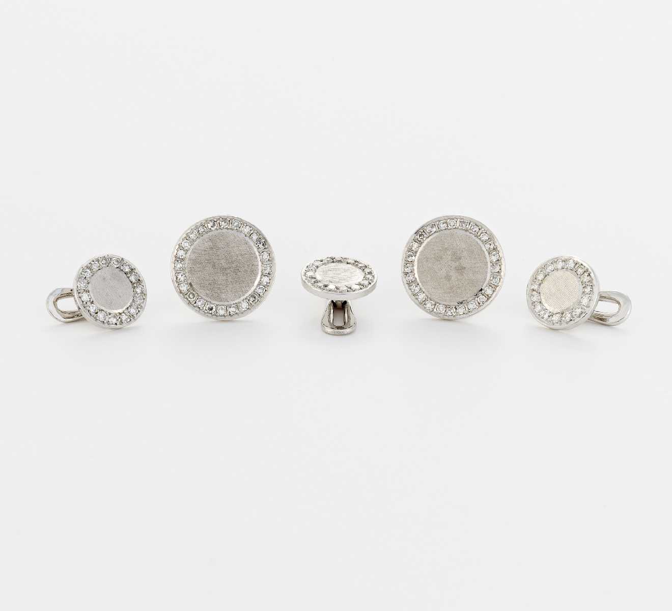 750/- Weißgold, gestempelt, Gewicht: 22,4g. 90 8/8 Diamanten, Manschettenkn.: D. ca. 1,5cm, Westenkn: D. ca. 1,1cm. Im Etui.
