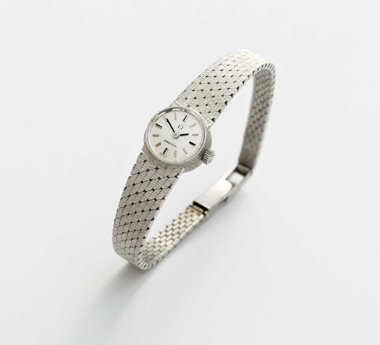 Damenarmbanduhr. 750/- Weißgold, gestempelt, silbernes Zifferblatt, silbrige Indizes, schwarze Zeiger, Handaufzug. D. 12mm, 17,5cm lang. Gewicht: 27,2g.