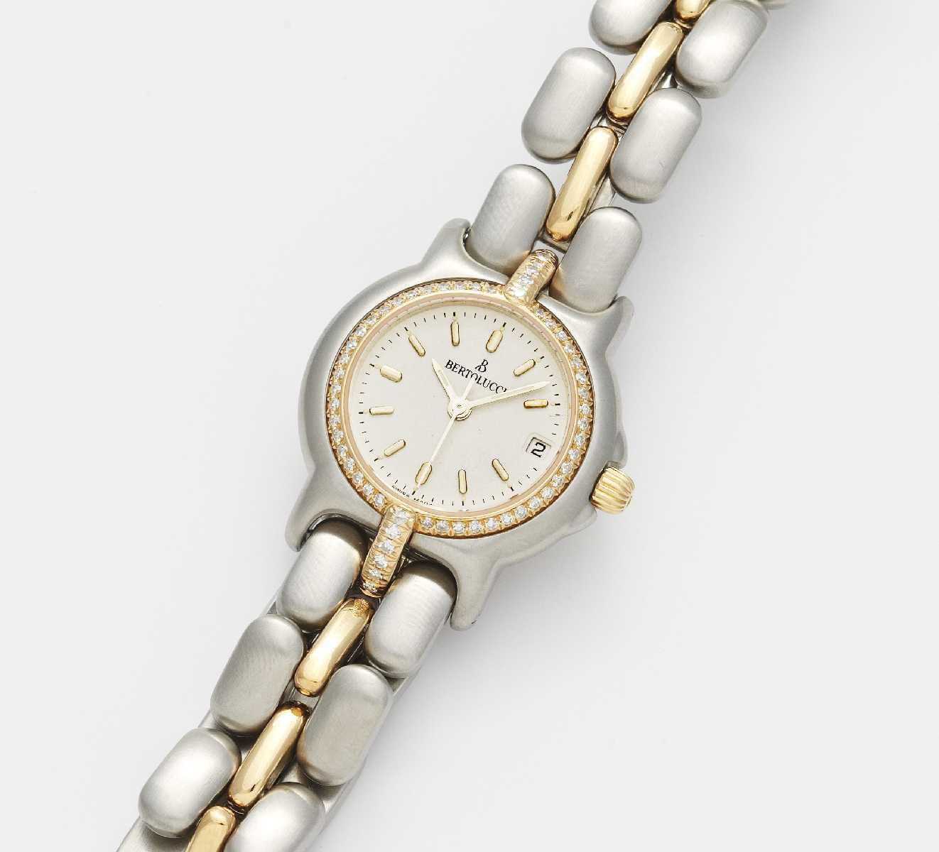 Pulchra. Damenarmbanduhr. Referenz-Nr.: 111.8055.49.6. Gehäuse: Stahl/vergoldet, weißes Zifferblatt, goldene Indizes, fluoriszierende Zeiger, Datumsanzeige, Diamantlünette, Quartz. D. 26mm, 19,0cm lang. Gewicht: 53,8g.