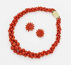 Verschluß: 750/- Gelbgold, gestempelt, Clips-Montur: unedles Metall, Gewicht: 90g. Ca. 198 orange-rote Mittelmeer-Korallperlen, ca. D.: 5.1 - 12.4mm, zu 3 Strängen, Ohrclipse: zu Blüten geschnittene Korallelemente ( 1 fehlende kl. Blütenspitze ),