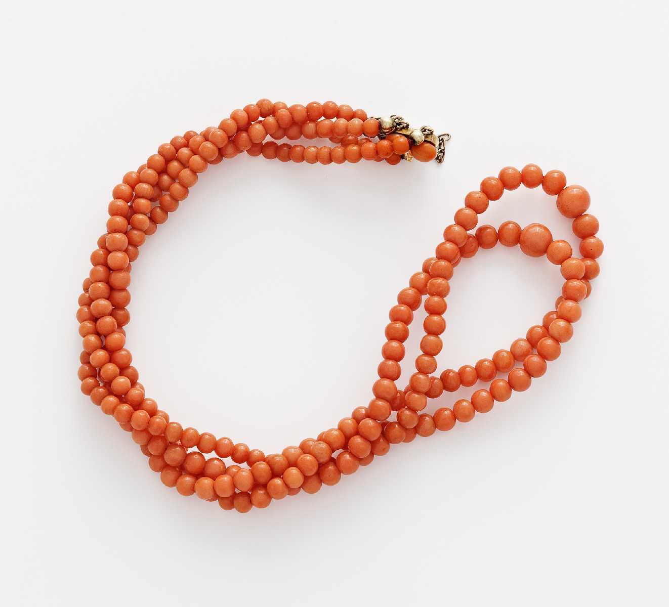 Verschluß: 585/- Gelbgold, gestempelt. 40g. Ca. 256 leicht barocke Mittelmeer-Korallperlen, dunkellachs-orange, D.: ca. 4.2 - 8.0mm,, Verschluß: 2 Korall-Boutons ca. D.: 6.0mm, sehr gute Farbqualität. Halslänge: 54cm.~