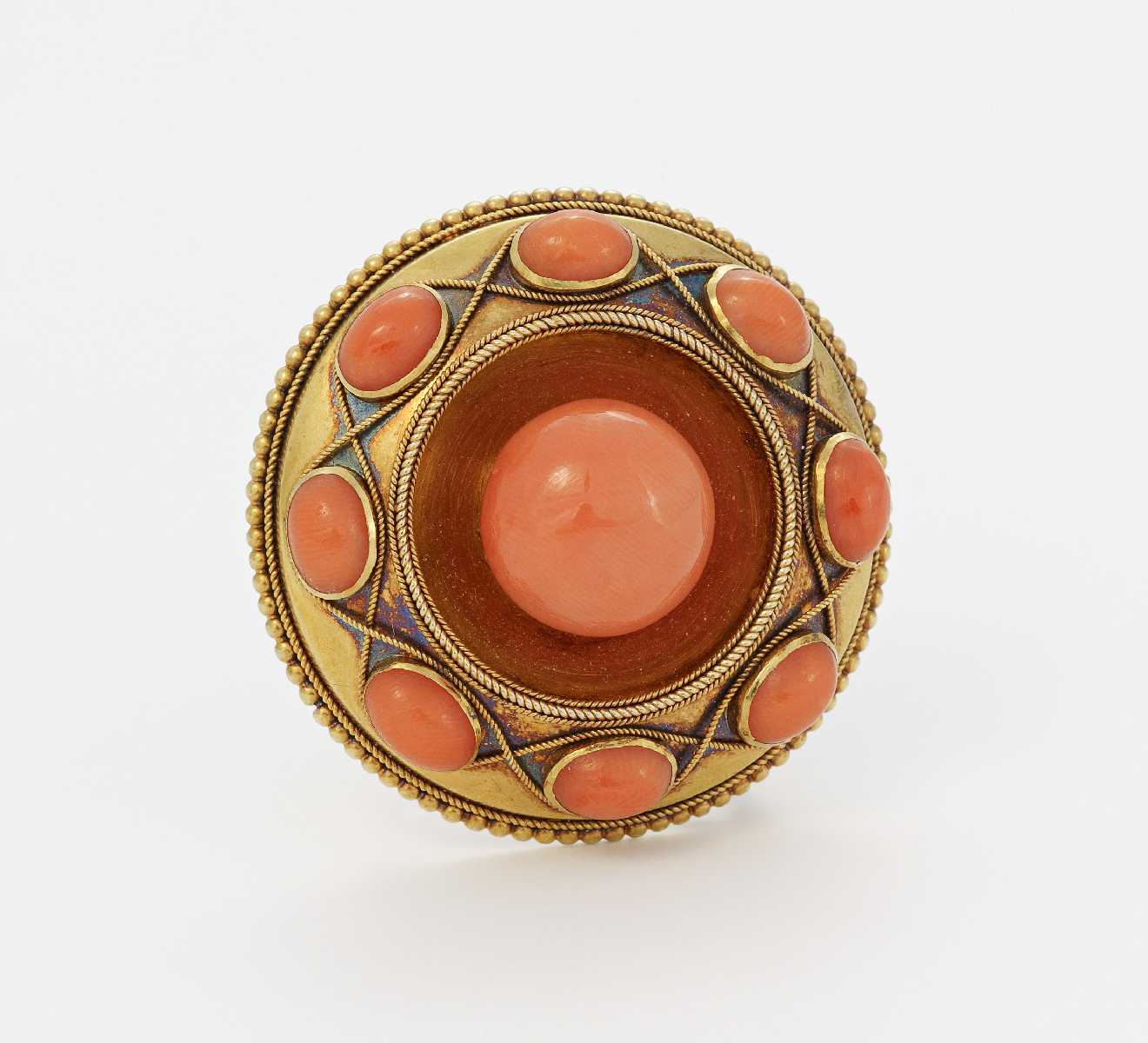 585/- Gelbgold, Gewicht: 17,4g. 8 ovale Korallcabochons, 1 runder Korallcabochon D. 13mm,