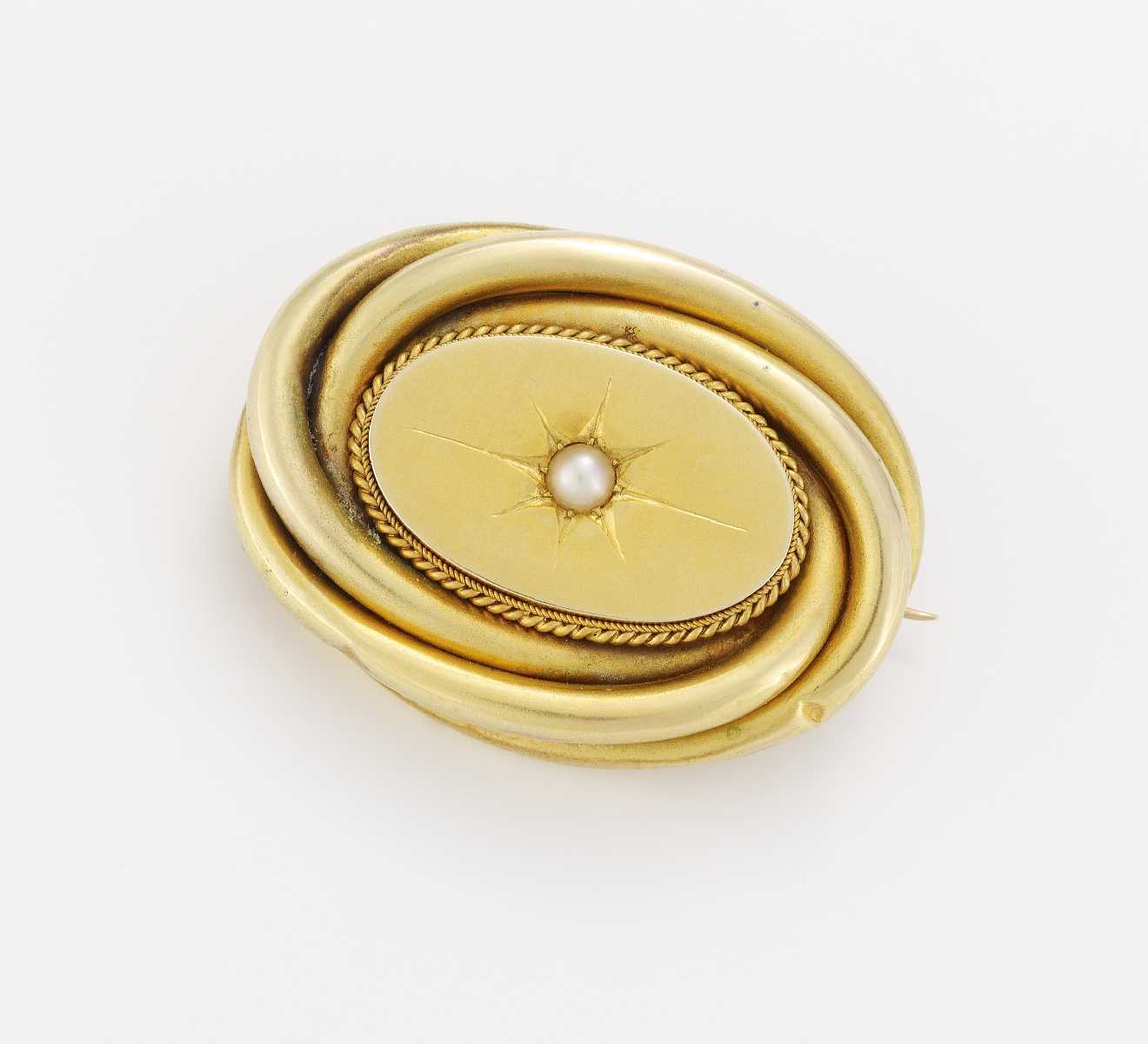 Goldfarben. 14,1g. 1 Süsswasser-Zuchtperle D. 3mm, créme. H x B=29 x 40mm.~ Rückseitig: Glasabdeckung mit Haareinlage.