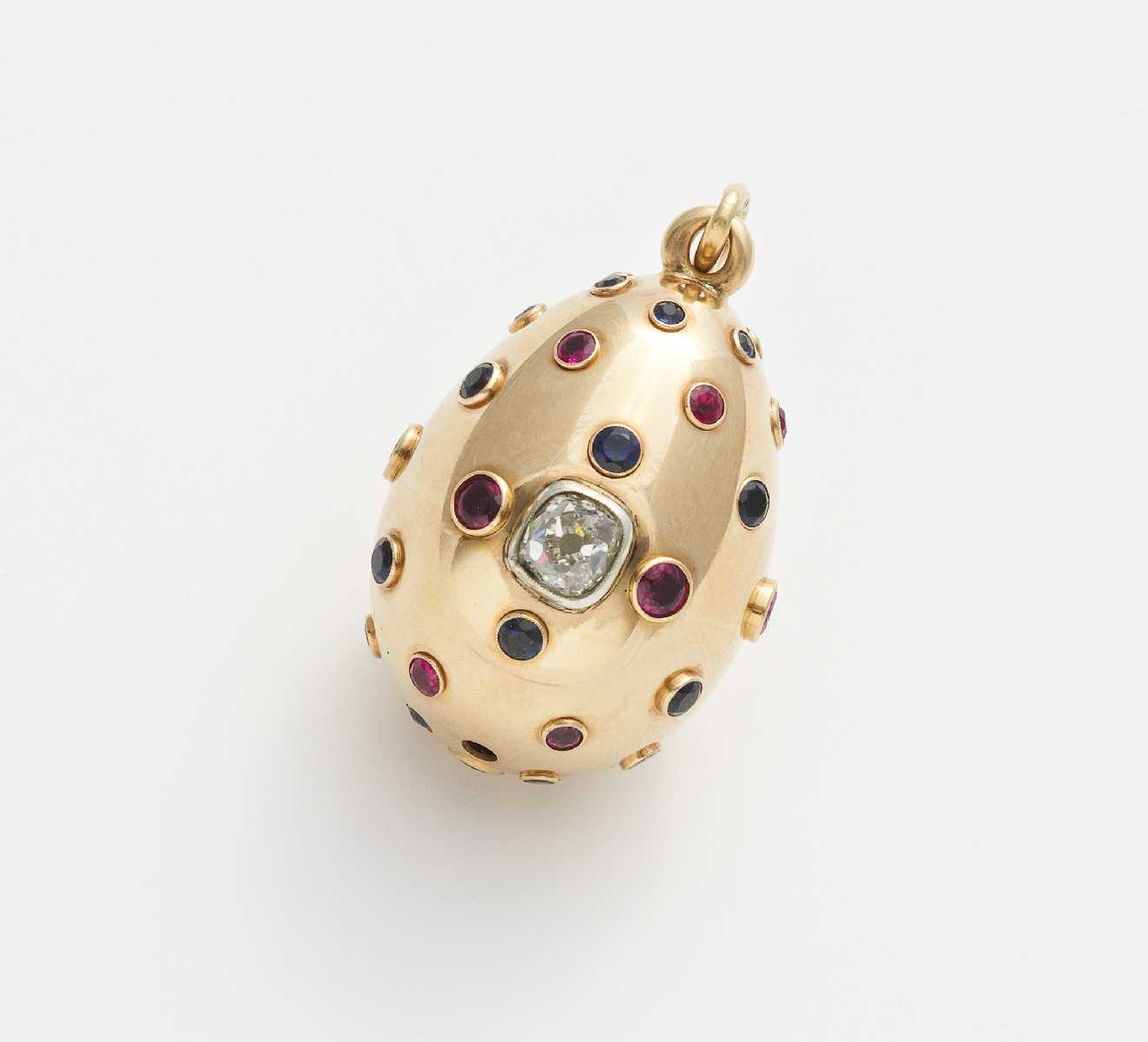 56 Zolotnik = ca. 585/- Roségold, Punzen, Gewicht: 12,1g. 24 rund facettierte Saphire zus.ca. 0,81ct, 19 rund facettierte Rubine zus.ca. 0,955ct, 1 Altschliff-Diamant, Cushion Cut ca. 0,59ct Chry(J-K)SI, H x B=3,9 x 2,2cm, Zustand: A.