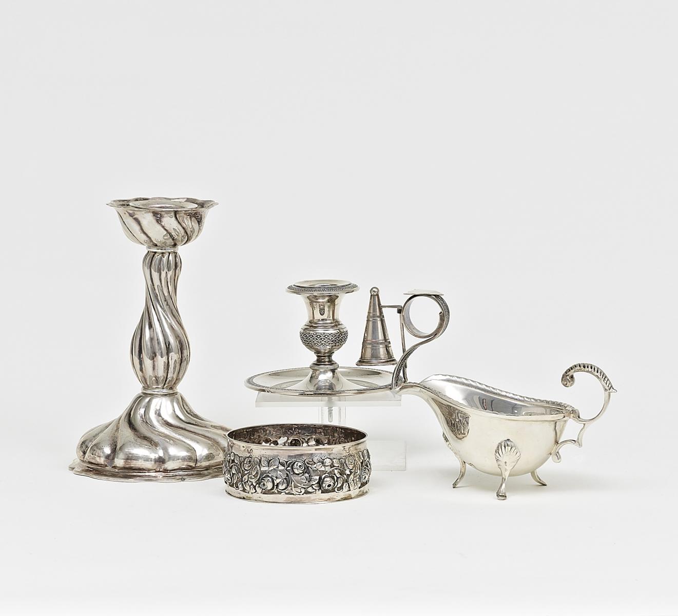 Silber. Leuchter, Flaschenuntersetzer, Handleuchter. {Beil.:}Kleine Saucière, versilbert. Ca.561g. Zustand A/B-B. Versilbertes Löschhütchen erg..