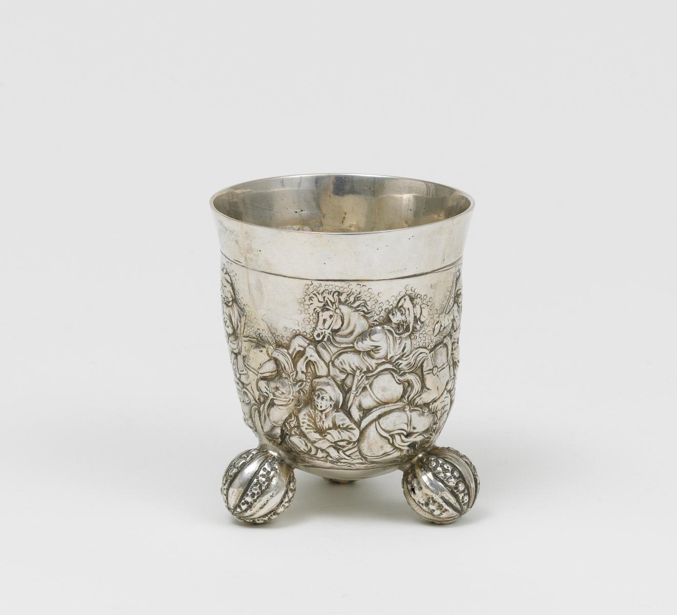 Kleiner Kugelfußbecher mit Reiterschlacht.