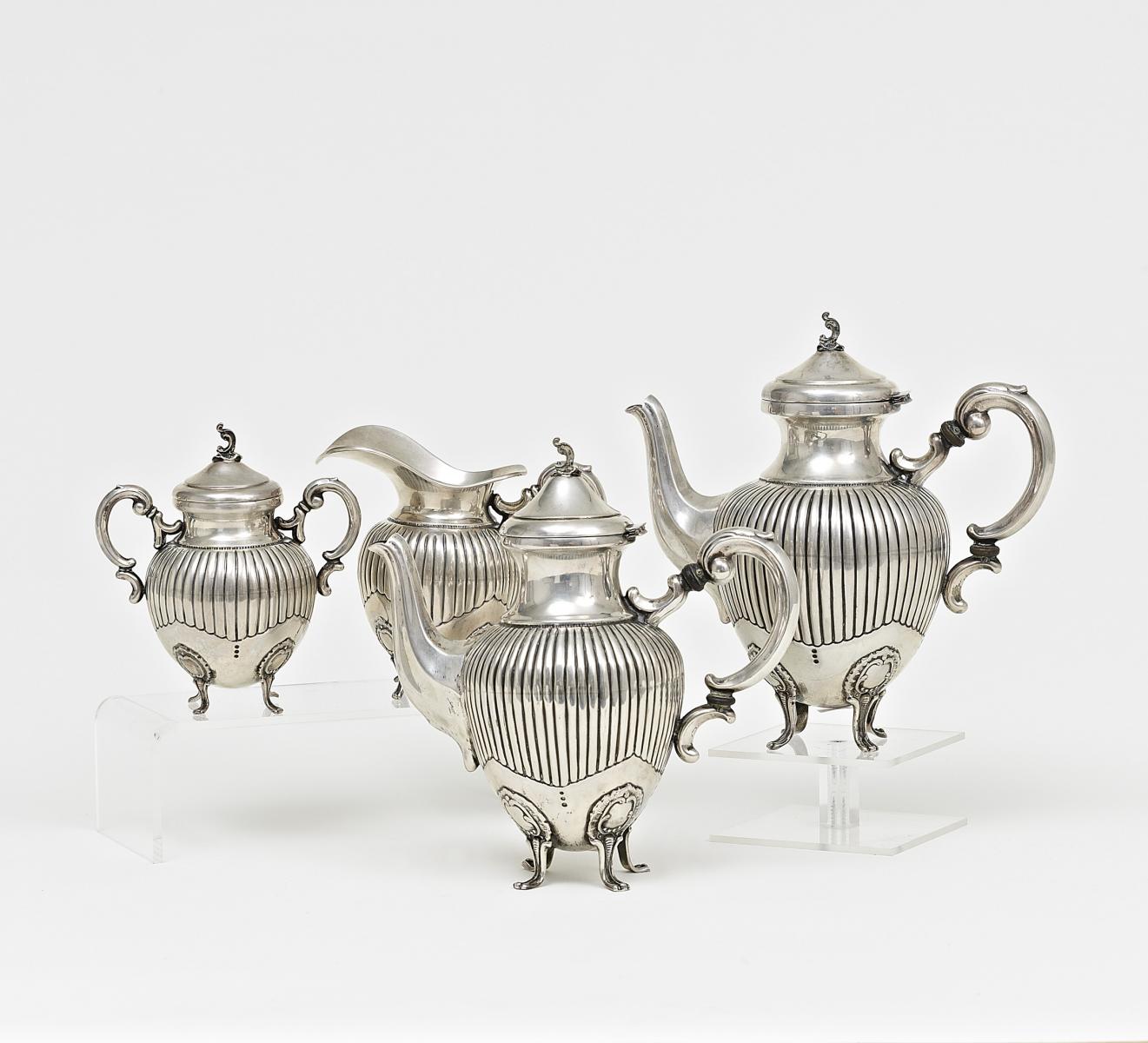 Silber. Kaffee- und Teekanne, Sahnegießer, Zuckerdose. H. der Kannen 23cm. Ca.1200g. Zustand A/B-B.