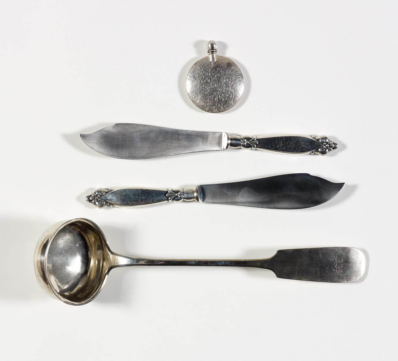 Silber. 2 Vorlegeteile, Kelle, kleiner Flakon. Ca.445g. Zustand A-B.