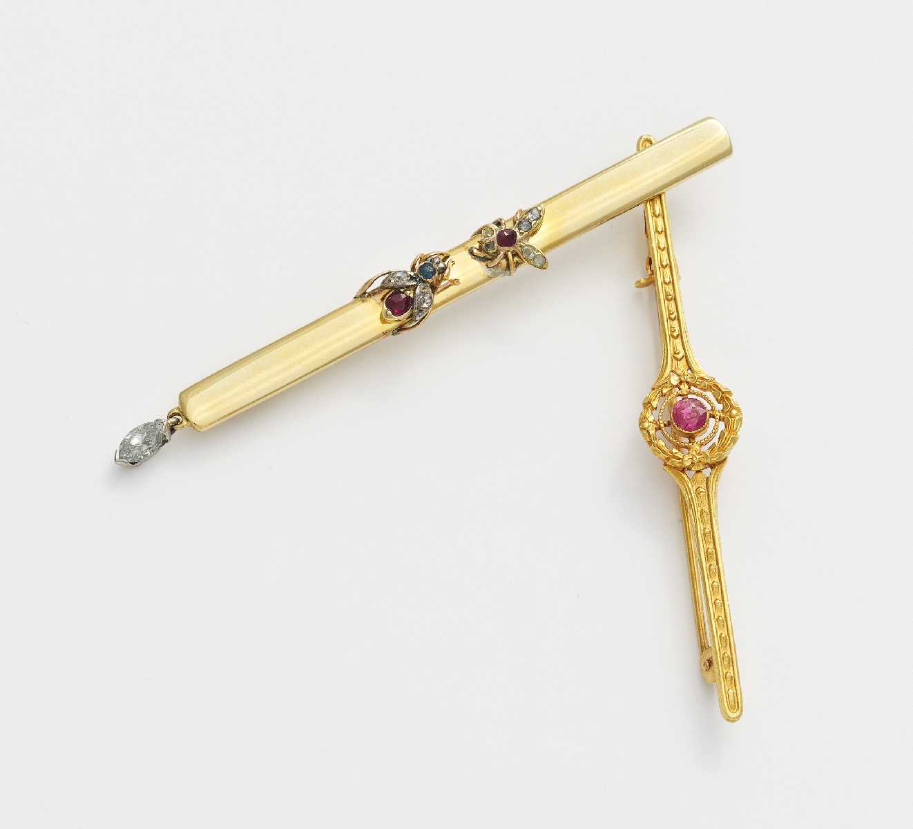 Konvolut: 2 Motivstabnadeln mit Edelstein- und Diamantbesatz.