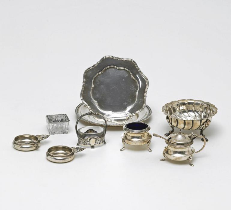 Silber, einmal blauer Glaseinsatz. {Beil.:} Salzgefäß. Versilbert. Ca.493g. Zustand A/B-B.