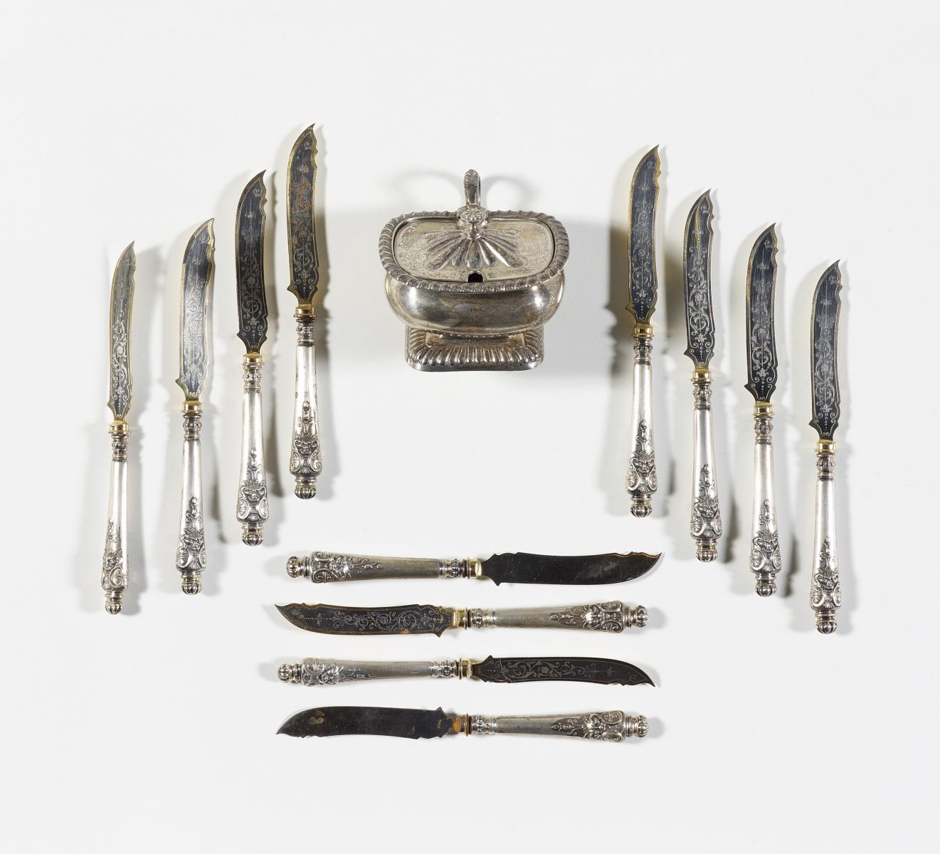 Silber, einmal blauer Glaseinsatz. Senfgefäß, 12 Dessertmesser. Ca.310g. Zustand A/B-B.
