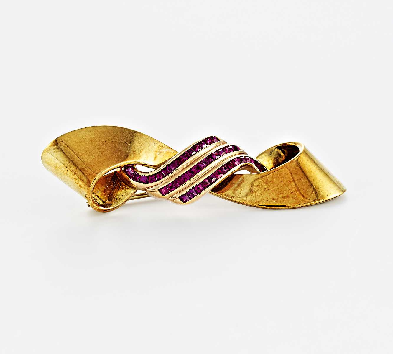 Stilisierte Schleifenbrosche mit Rubinbesatz.