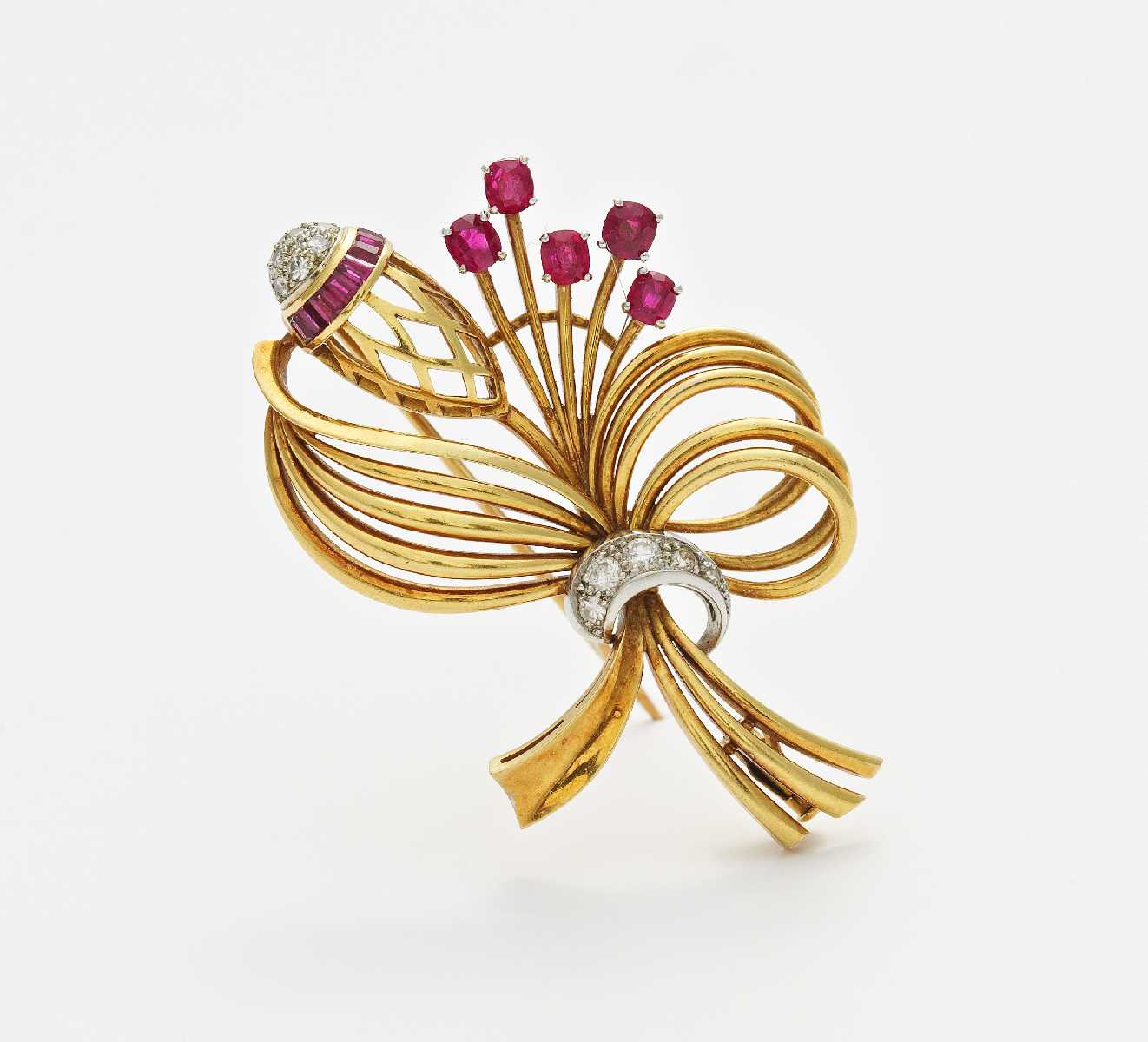 Florale Brosche mit Rubin-Diamantbesatz.