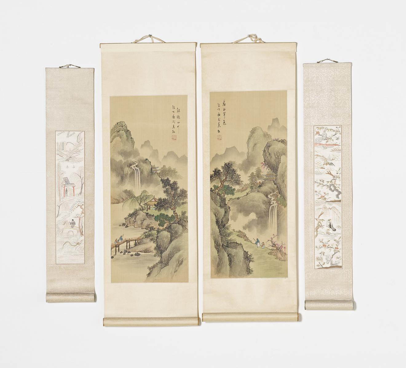 Seidenstickerei und Tuschezeichnungen. L.78 bzw. 89cm. Zustand A/B.