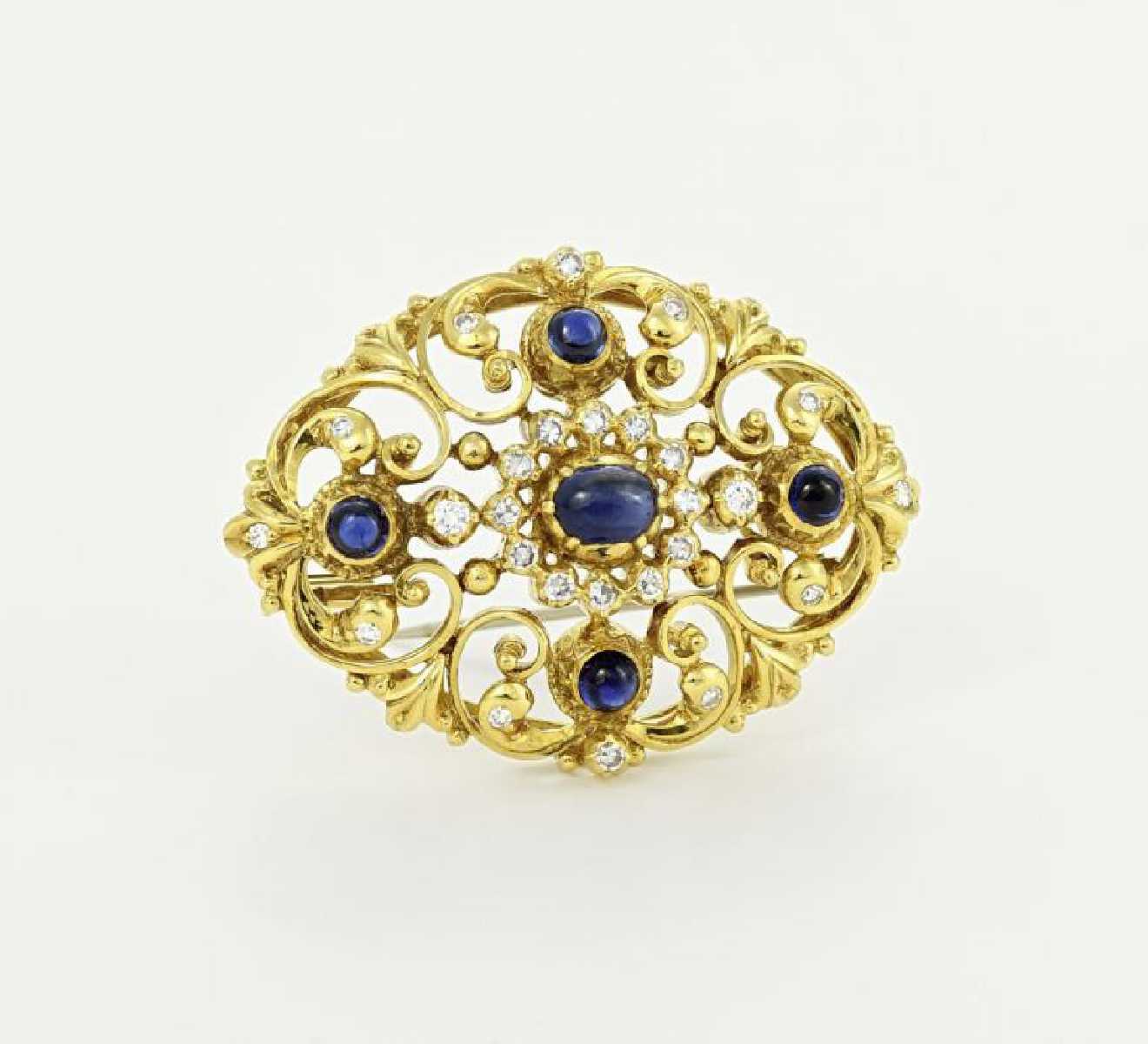 750/- Gelbgold, Gewicht: 16,5g. 5 dunkelblaue Saphire im Cabochonschliff, 1: oval 6.5 x 4.5mm, 4: rund 3.5mm, 24 8/8 Diamanten und 2 Brillanten, L x B=3,0 x 4,5cm.