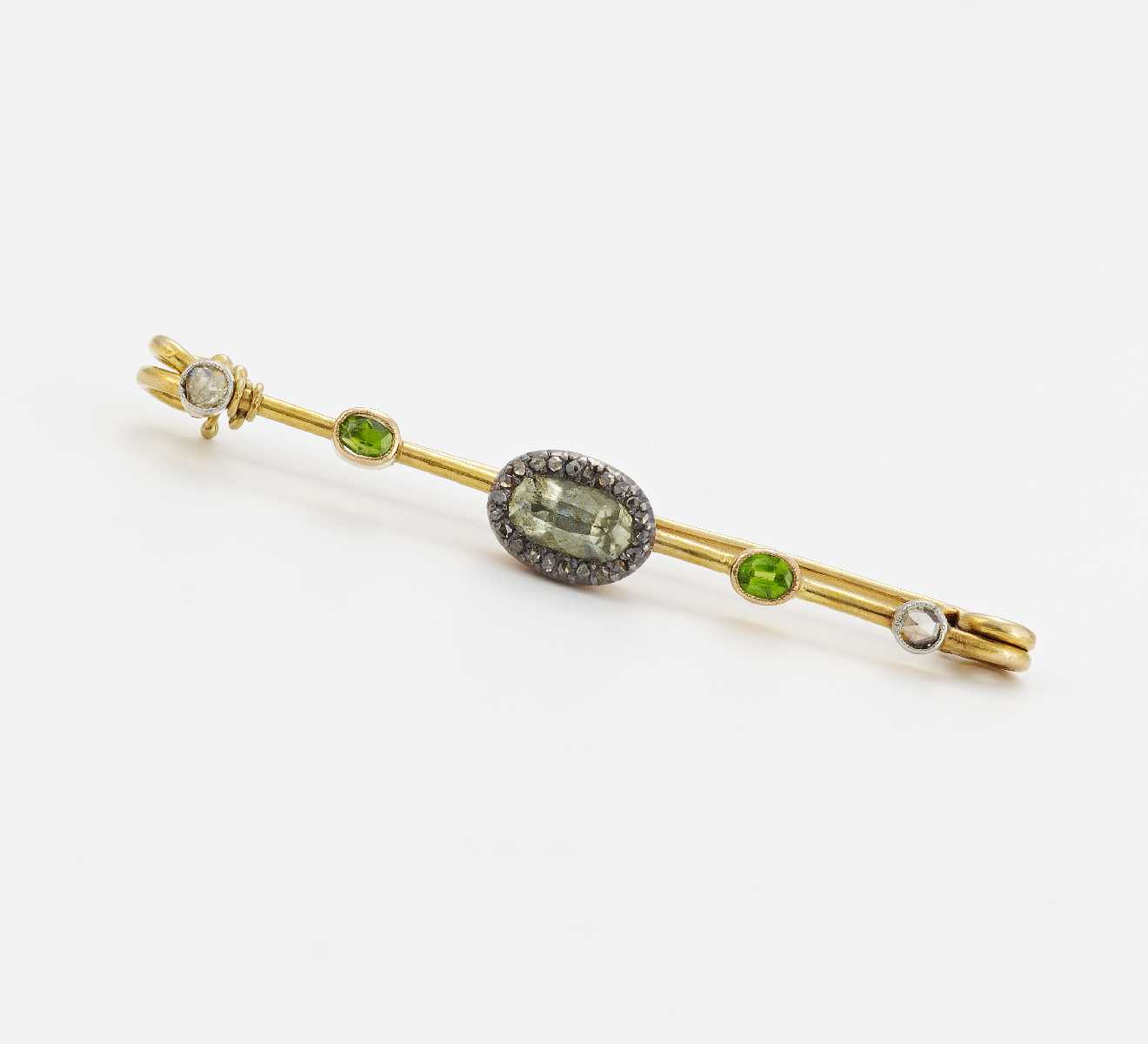Goldfarben, Silberverbödung. 4,8g. 2 facettierte Demantoide (Granat-Gruppe), 1 oval facettierter lauchgrüner Stein, zahlreiche Diamantrosen, L x B=55 x 6mm.~