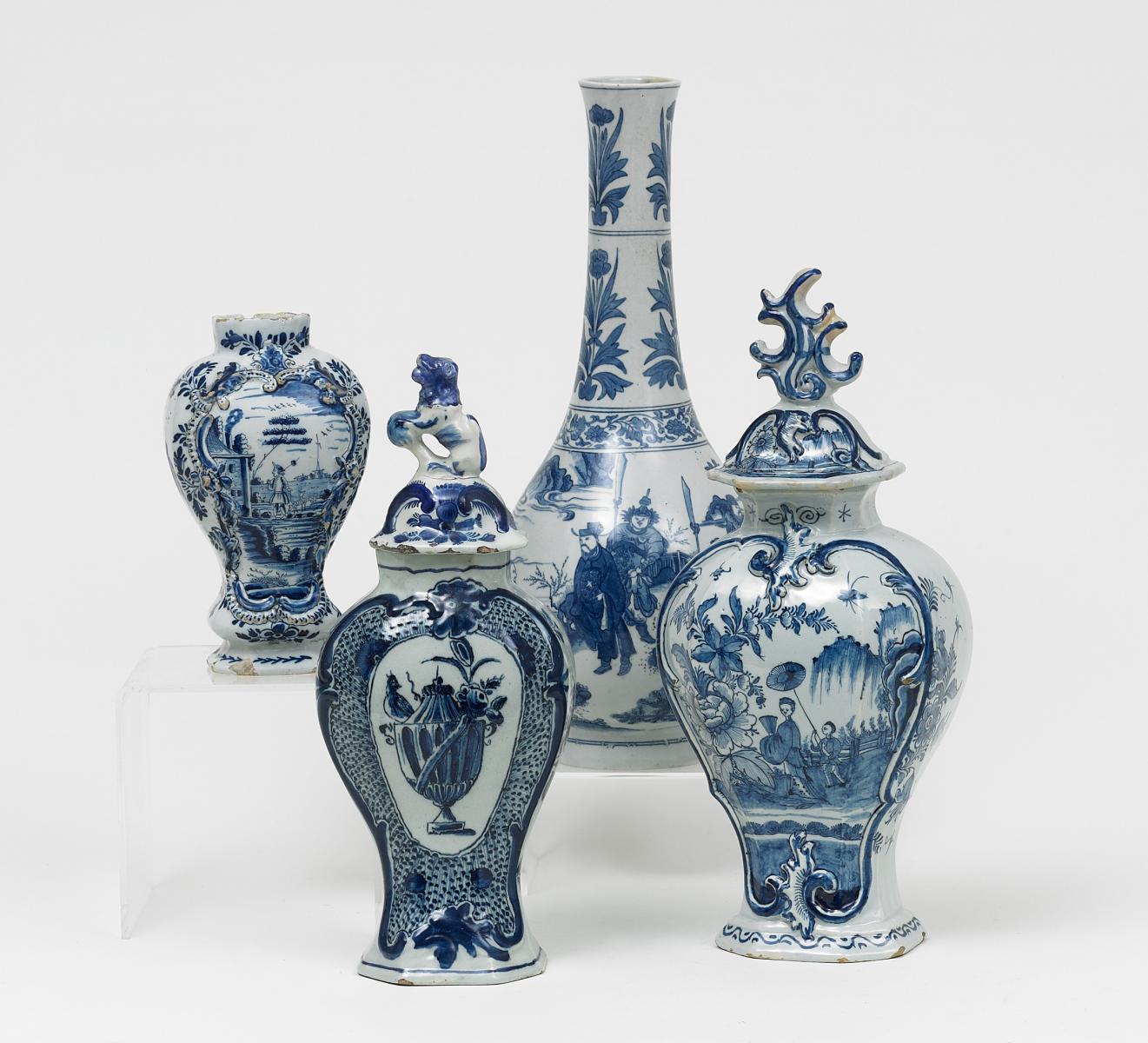 Heller Scherben, weiß glasiert, blaues Dekor. H.38/33,5/20/40cm. Zustand B/C.