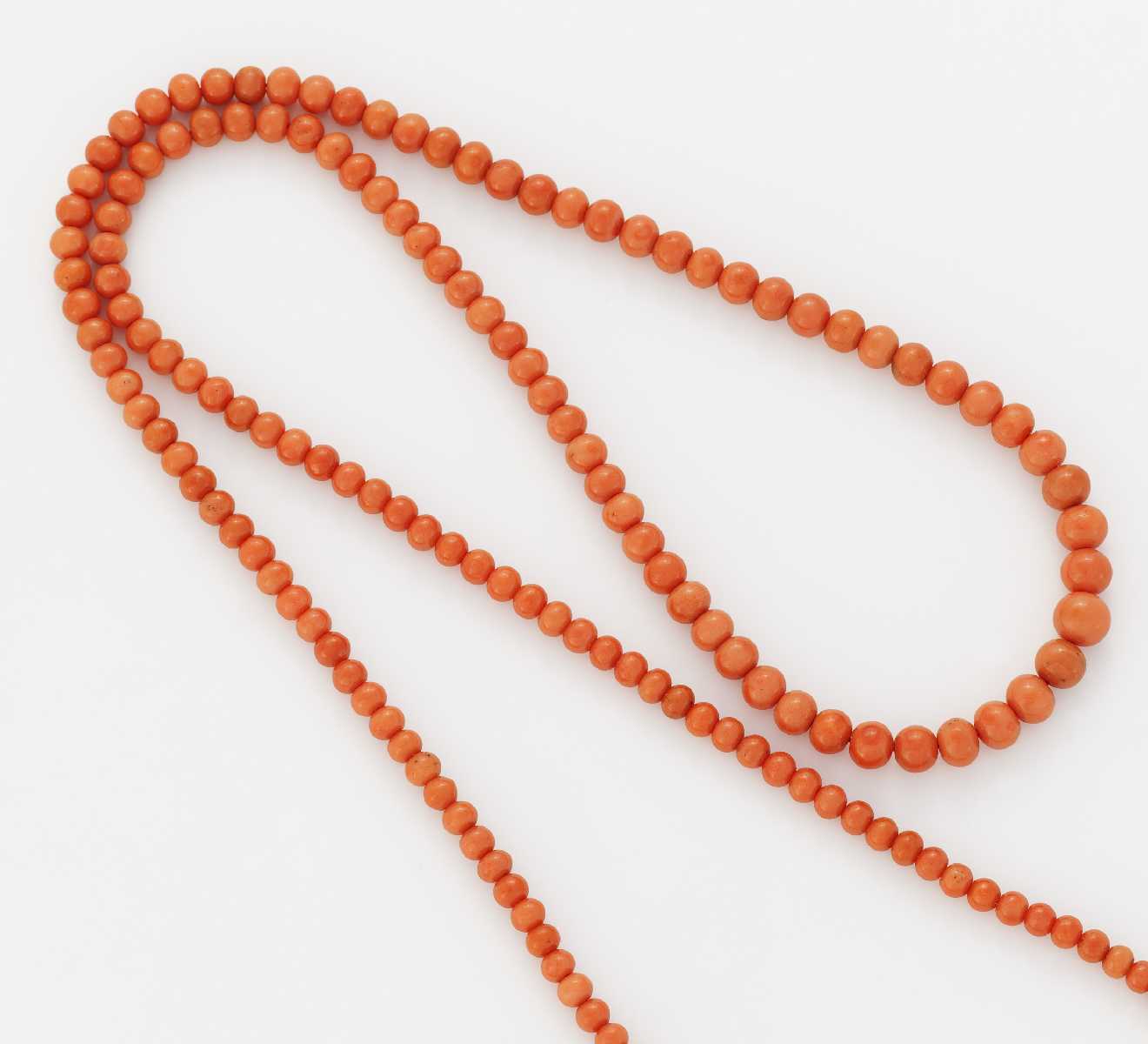 Verschluß: Gelbgold, Gewicht: 58.4g. Ca. 178 barocke Mittelmeer- Korallkugeln, lachs-orange, D.: ca. 4.8 - 9.2mm, gute Farbqualität,