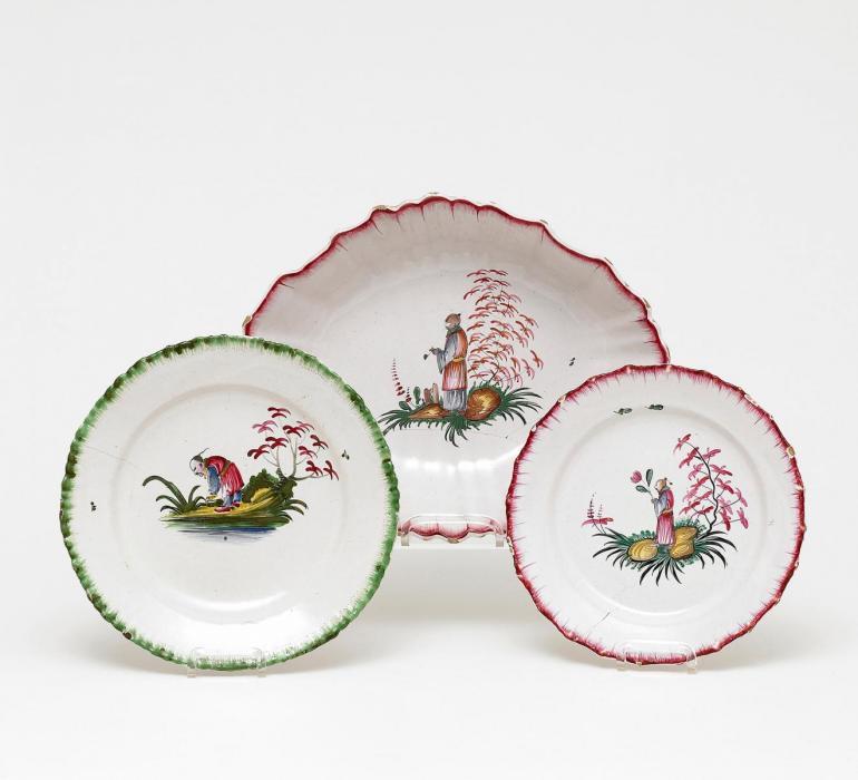 Beiger Scherben, weiß glasiert, polychromes Dekor. Chinesen in Landschaft. 6,5x32x26/ + 24/21,5cm. Zustand B-C.
