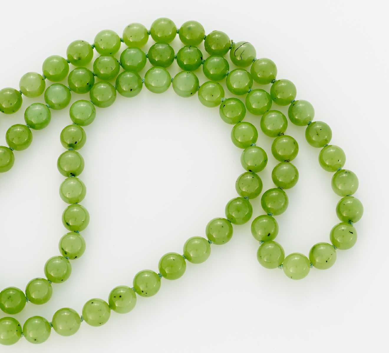 Gewicht: 131,1g. 82 sattgrün geknotete Jadekugeln, D. 10mm,