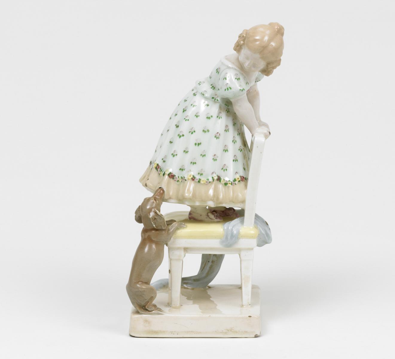 Biedermeier Mädchen auf Stuhl mit Dackel.