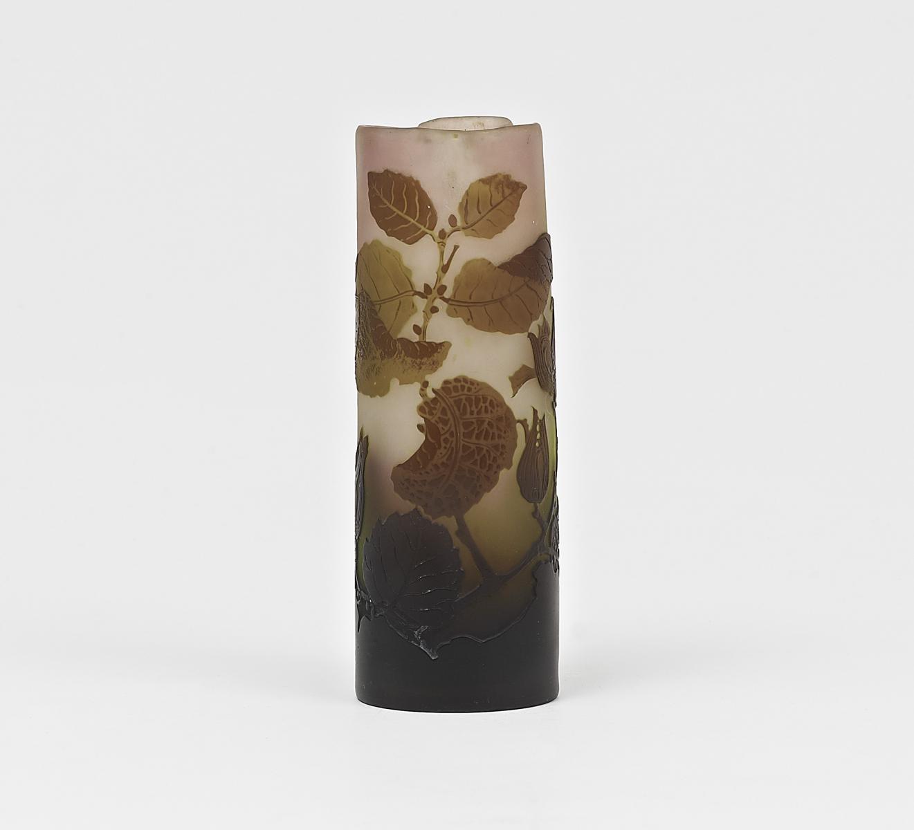 Farbloses Glas, innen weiß und violett, außen grünbraun überfangen. H.21,5cm. Zustand C.
