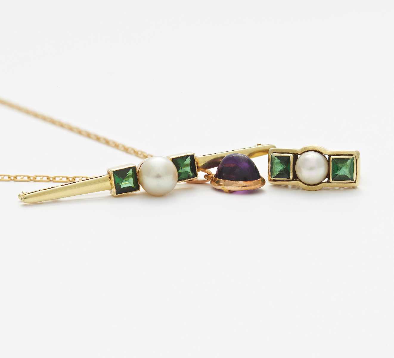 Kette: 750/-Gelbgold, gest., Anhänger: 585/- Rosegold, gest., Stabnadel: 585/- Gelbgold, gest., Ring: 585/- Gelbgold, gest.. Total: 18,8g. 4 grüne Turmalin-Karrees, 1 ovaler Amethyst Cabochon, 2 Akoya-Zuchtperlen D.: ca. 7,5 - 9,0mm, creme. EU-RM: 57. Stabnadel L= 6,2cm, Anhängerkette: 38cm.~
