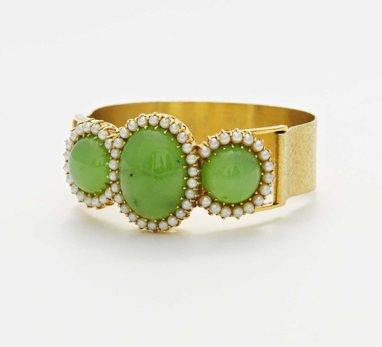 Gezierte Armspange mit Jadeit- und Perlbesatz.