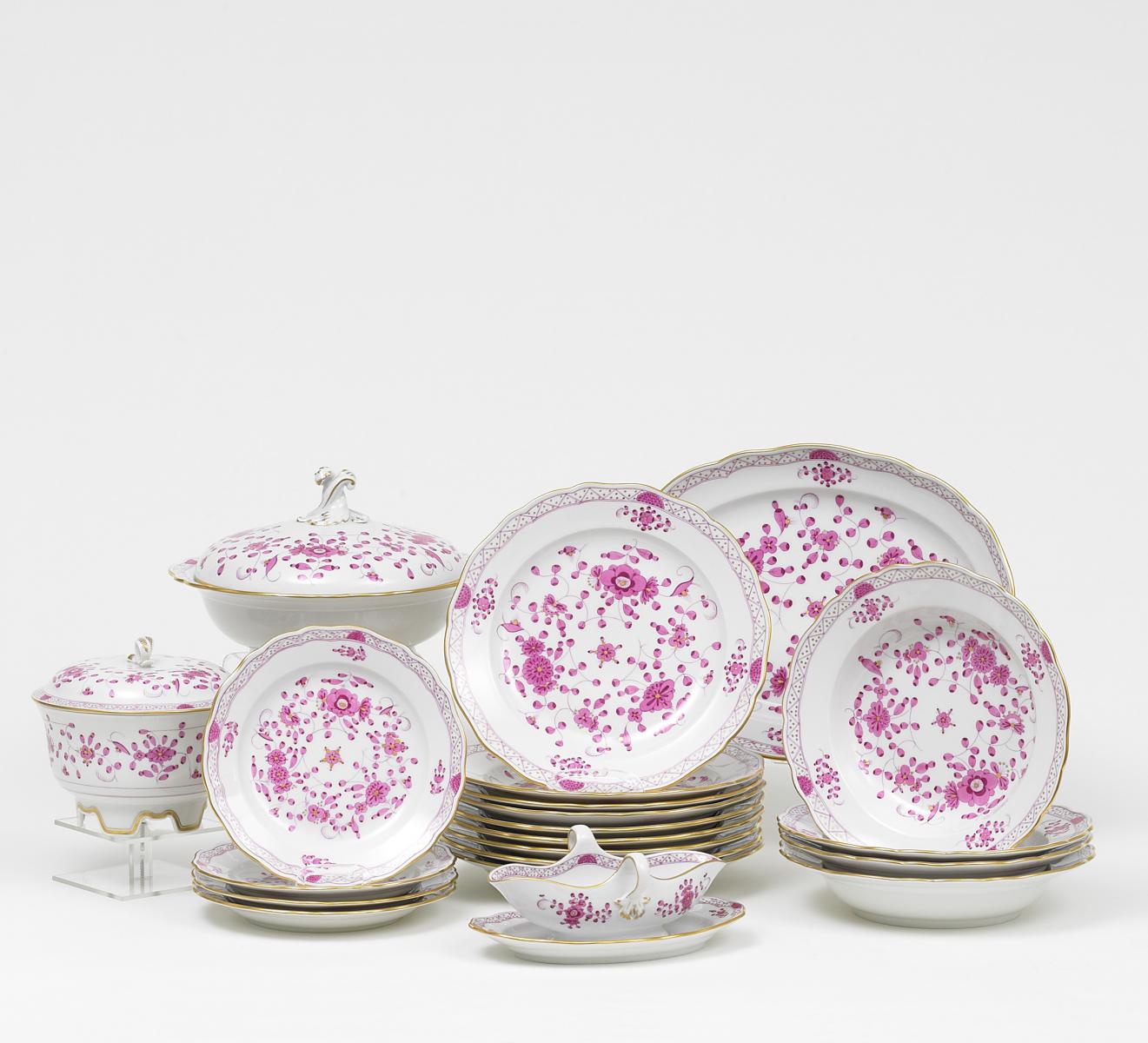 Porzellan, purpurn und gold staffiert. Insg. 38 Teile. 2 Terrinen, 2 Schalen, 1 Platte, 1 Saucière, 11 Speiseteller, 9