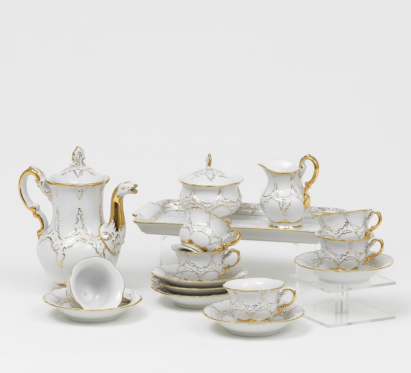 Porzellan, gold staffiert. Insg. 16 Teile. 1 Mokkakanne, 1 Milchkanne, 6 Tassen m. UT., 1 Zuckerdose, 1 kl. Tablett. Zustand A/B.