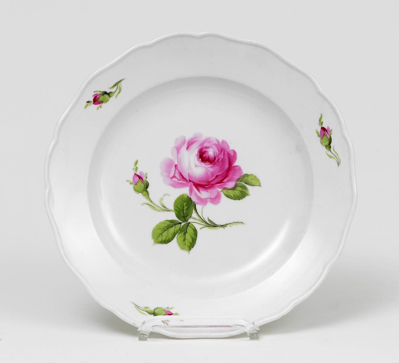 Porzellan, farbig staffiert. {Beil.:} Teller. Fayence. + 24,5cm. Zustand A/B.