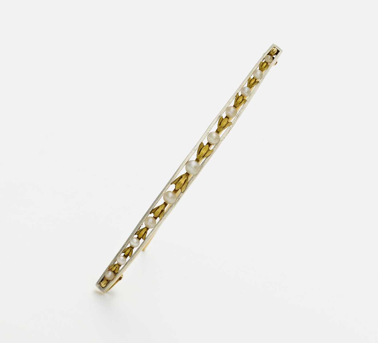 750/- Gelbgold und Weißgold, Punze. 7,0g. 11 kleine Flußperlen D.:ca. 1,9 - 3,4mm. Länge: 7,0cm.~