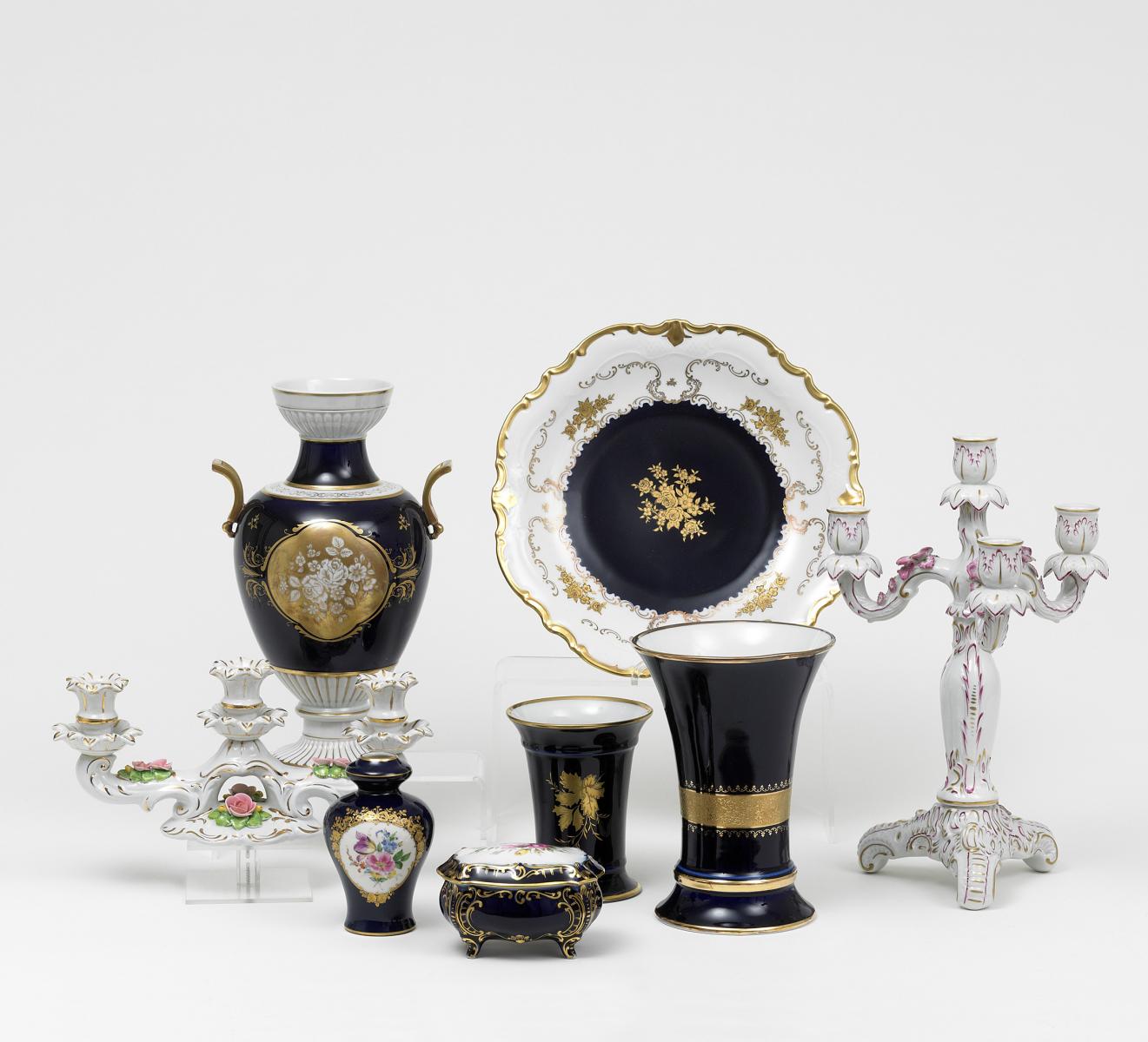 Porzellan, vorwiegend blau und gold staffiert. Zustand A/B. -C.