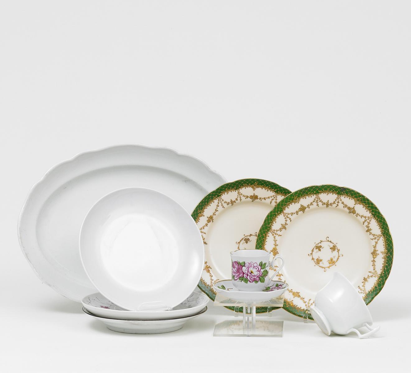 Konvolut zwei Tassen, eine Untertasse, fünf Teller, eine Platte.
