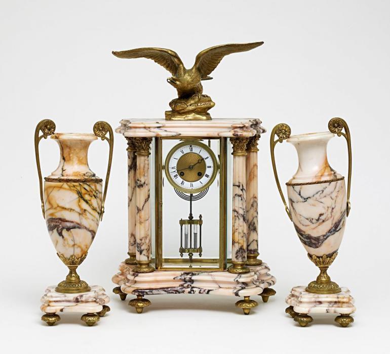 Rosa Marmor. Vergoldete Bronze. Pendulewerk mit Federaufhängung und Schlag auf Glocke. Quecksilberpendel. H.55/ 41cm. Zustand B/C.