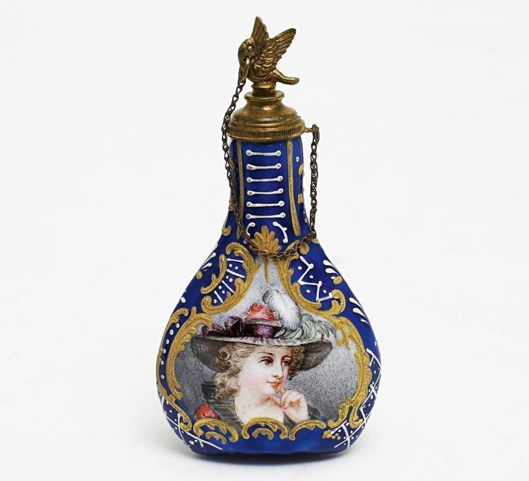 Metall mit Emaildekor. Bronzemontierung. Mit Damenbildnis und Blumen. H.10cm. Zustand B.