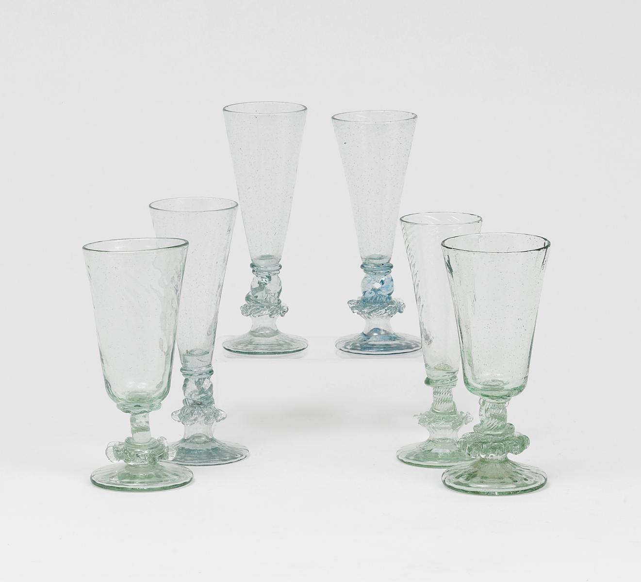 Leicht grün oder bläulich gefärbtes Glas. 12 Sekt- und 16 Weingläser. H.19-21,5cm. Zustand A/B-B.