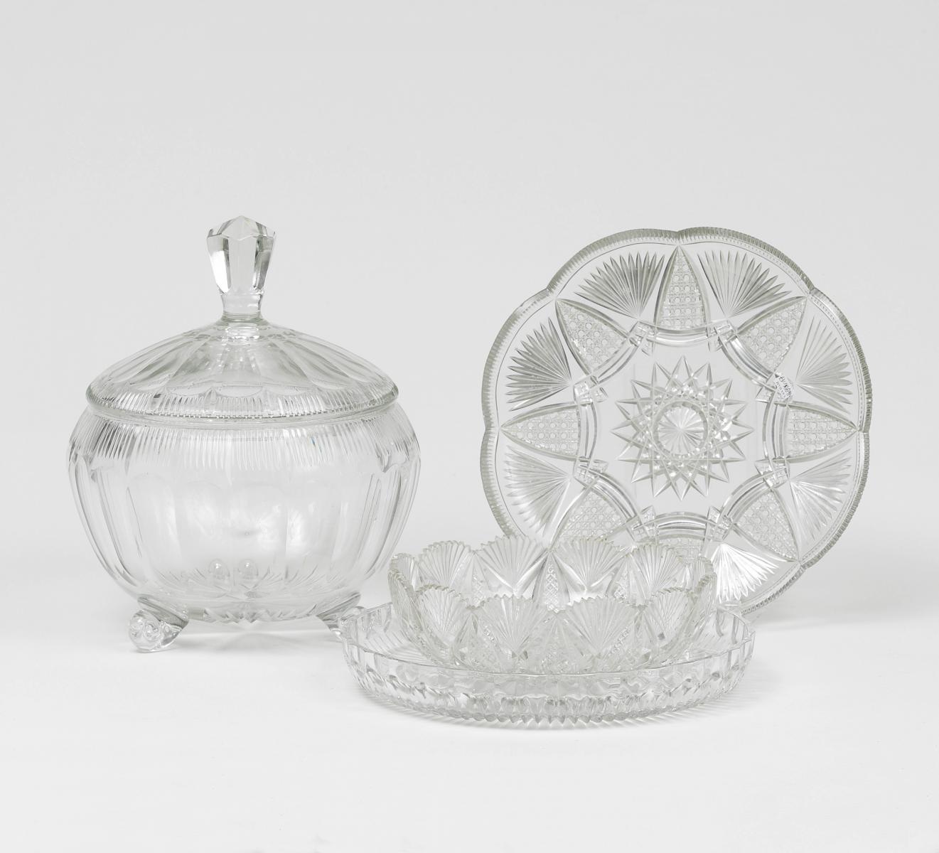 Farbloses Kristallglas mit Schliffdekor. Bowle, Schale und 2 Platten. H. der Bowle 32, + 27/ + 23,5-32cm. Zustand A/B-B.