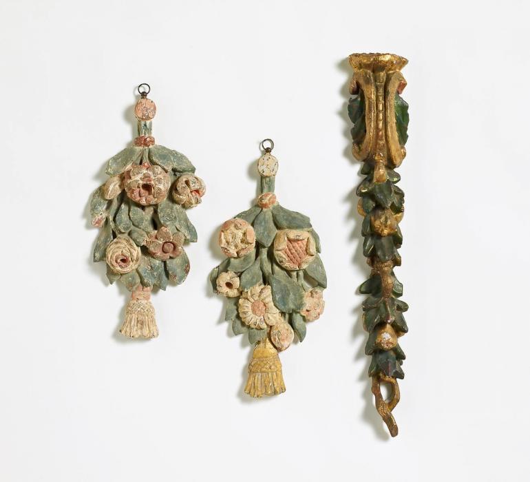Konvolut drei Dekorationen Blumen-und Fruchtgebinde. Süddeutsch. Wohl 18.Jh. Holz geschnitzt und gefasst. Zustand B.
