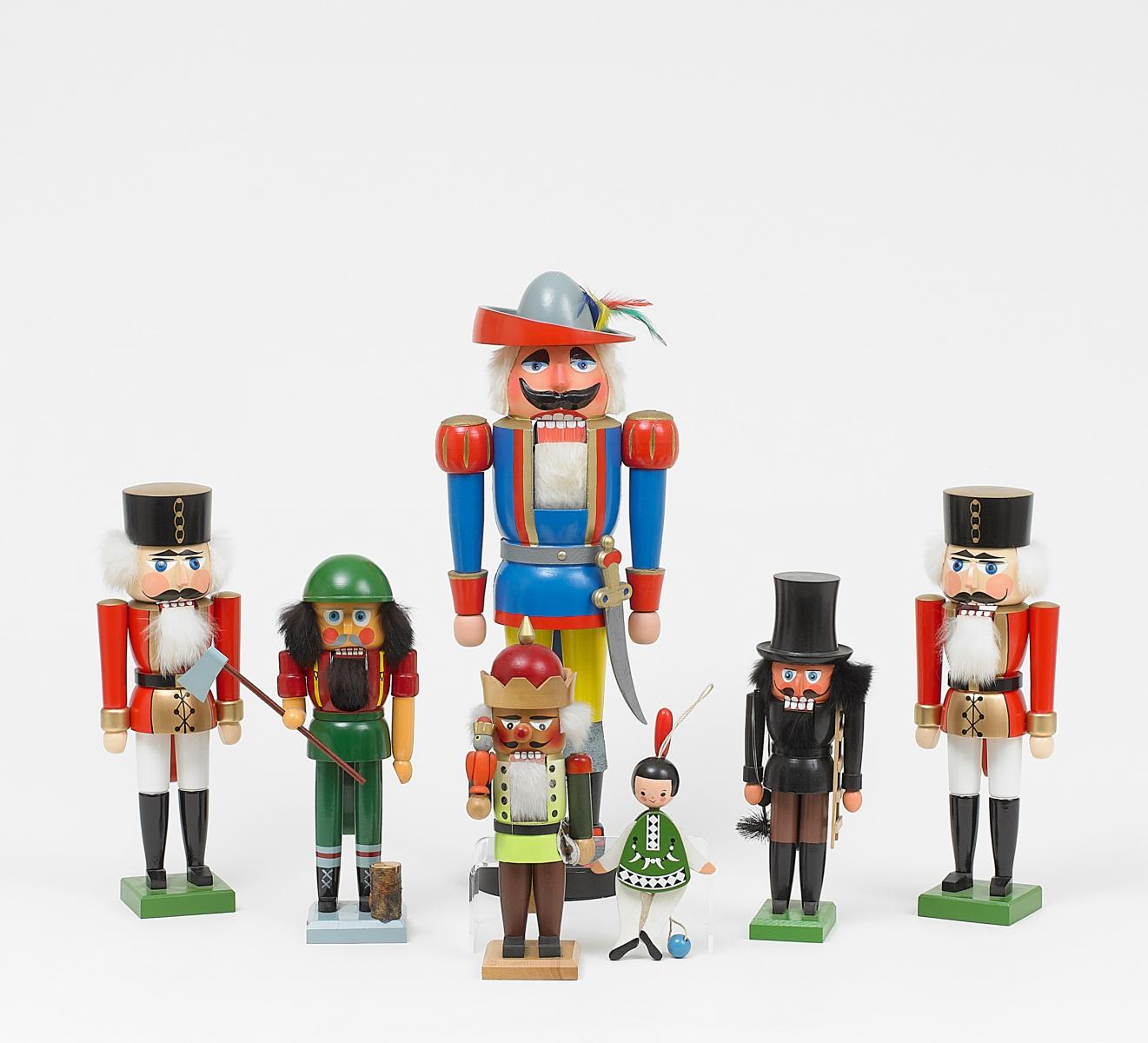Konvolut sechs Nussknacker, ein Hampelmann.